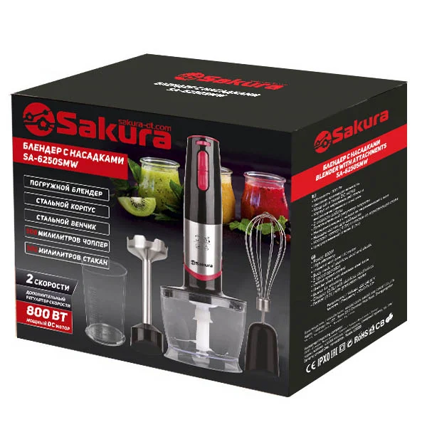 Блендерный набор, 800 Вт, мощный и тихий DC мотор, 2 скорости работы + дополнительная регулировка, острые лезвия из нержавеющей стали, 3 насадки (блендер, венчик, чоппер 0,5 л), стакан (0,5 л), погружная часть блендера из нержавеющей стали. Цвет: черный/красный.