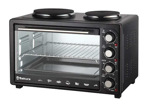 Объем 23 л, мощность 3080 Вт, мощность духовки 1380 Вт, механическое управление, 3 режима работы духовки, 2 чугунные конфорки 1000Вт+700 Вт (диаметр 145 мм), раздельная регулировка температуры духовки и конфорок (плавная). Комплектация: металлическая решетка, противень и ухват. Цвет черный