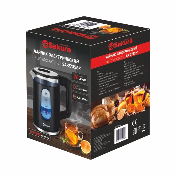 2.0 л, 1500-1800 Вт, корпус из закаленного стекла, пластика и нержавеющей стали, диск, вращение на 360°, точечная подсветка, отключение при закипании и включении без воды, индикатор работы.
