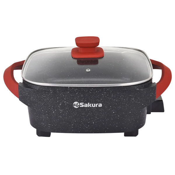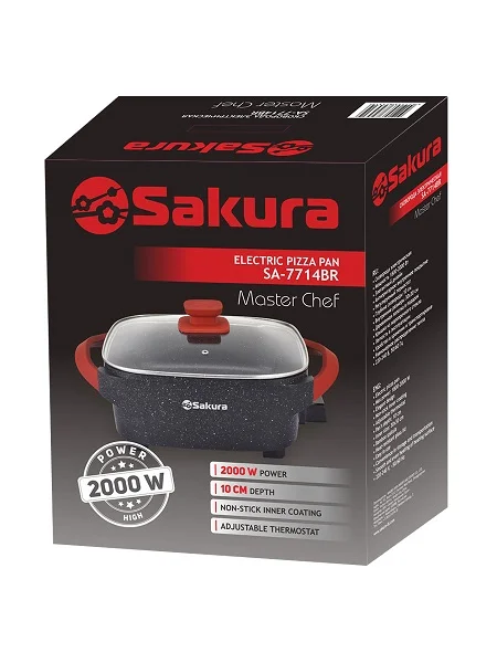 Сковорода электрическая, 1800-2000 Вт, диаметр 30 см, глубина 10 см, механическое управление, алюминиевый корпус с антипригарным покрытием, крышка из закаленного стекла, бакелитовые ручки с покрытием "soft touch", регулируемый термостат, прорезиненный шнур 1.2 м.