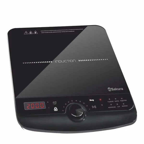 Плита электрическая индукционная SA-7163 Premium, мощность 2000 Вт, индукционный нагревательный элемент, LED-дисплей, сенсорное и механическое управление, варочная поверхность из стеклокерамики, 6 автоматических режимов работы: тушение, жарка, барбекю, кипячение, на пару, молоко, 10 режимов нагрева (200-2000 Вт), регулировка температуры от 60 до 240°С, функция таймера до 180 мин, блокировка панели управления, отсрочка старта до 24 ч. Диаметр конфорки 200 мм. Цвет корпуса: черный.