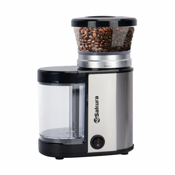 Мощность мотора 150 Вт, загрузка 150 грамм, жерновой тип, регулировка степени помола от 1 до 9, корпус из нержавеющей стали, жернова из нержавеющей стали, съемный контейнер из пластика.