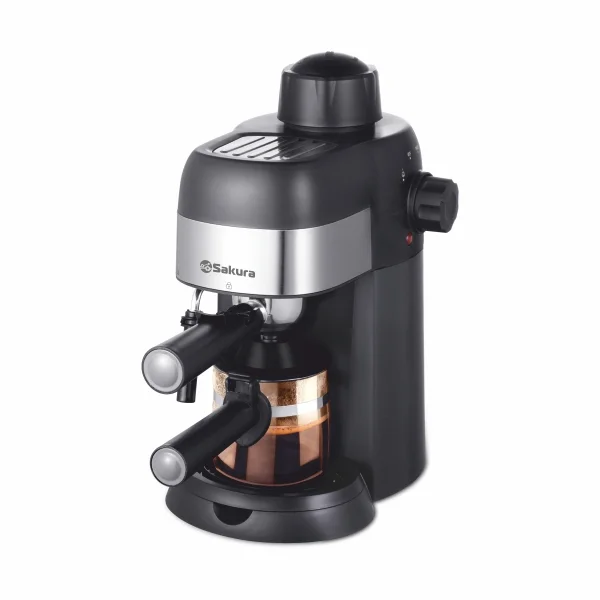 Кофеварка рожкового типа, приготовление эспрессо и капучино, вместимость 0,25 л, емкость для кофе из закаленного стекла, 4 бар, насадка для капучино, съемный поддон, рожок с фильтром из нерж.стали, мерная ложка с уплотнителем в комплекте. Мощность 800 Вт.