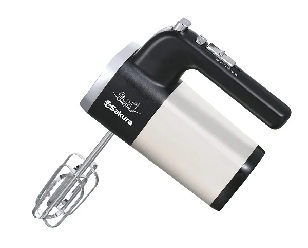 Ручной миксер, мощность 600 Вт, 5 скоростей работы + турбо-скорость, защита от перегрева, корпус и насадки из нержавеющей стали, в комплекте венчики для взбивания и крюки для замешивания теста.