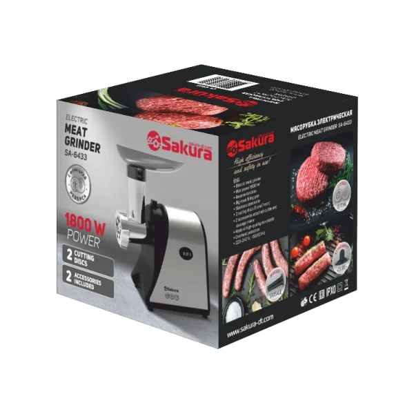 Мясорубка электрическая 1800 Вт, функция реверс, корпус из плаcтика + нержавеющая сталь, мощный мотор с защитой от перегрева, набор решеток для фарша: маленькая (5мм), средняя (7мм), прорезиненные нескользящие ножки. Аксессуары: насадки для приготовления сосисок и колбасок кеббе. Цвет: черный/нержавеющая сталь. Длина шнура: 1м.
