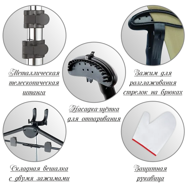 | Комплектация: | складная вешалка с зажимами для брюк, насадка для проглаживания стрелок на брюках, насадка-щетка, защитная рукавица |