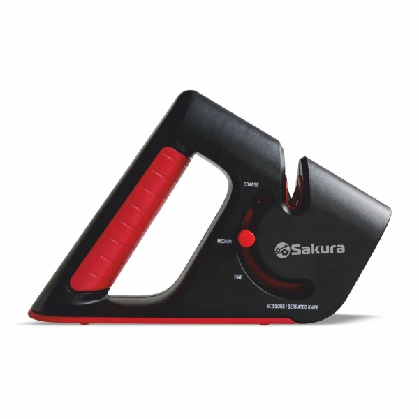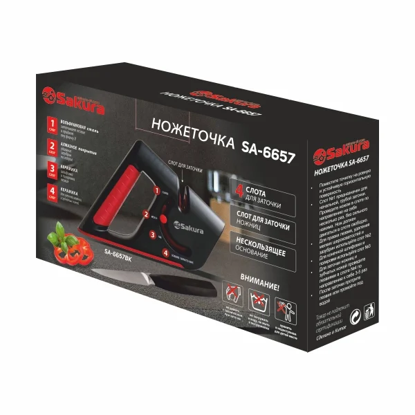 Универсальная ножеточка, 4 слота для заточки: вольфрамовая сталь (подготовка, правка), с алмазным покрытием (заточка, исправление повреждений), с керамическим покрытием (полировка, шлифовка), с керамическим покрытием для заточки ножниц и зубчатых ножей, нескользящее основание, прорезиненная ручка.
