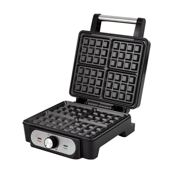 1400 Вт, корпус: черный пластик/нержавеющая сталь, форма для толстых венских вафель, размер панелей 25 × 21.6 см, антипригарное покрытие Teflon, регулятор температуры (150С-210С), 2 световых индикатора (работы и нагрева), нескользящее основание, защита от перегрева, безопасная ручка Cool Touch, прорезиненный шнур питания 75см. Цвет: черный/нержавеющая сталь