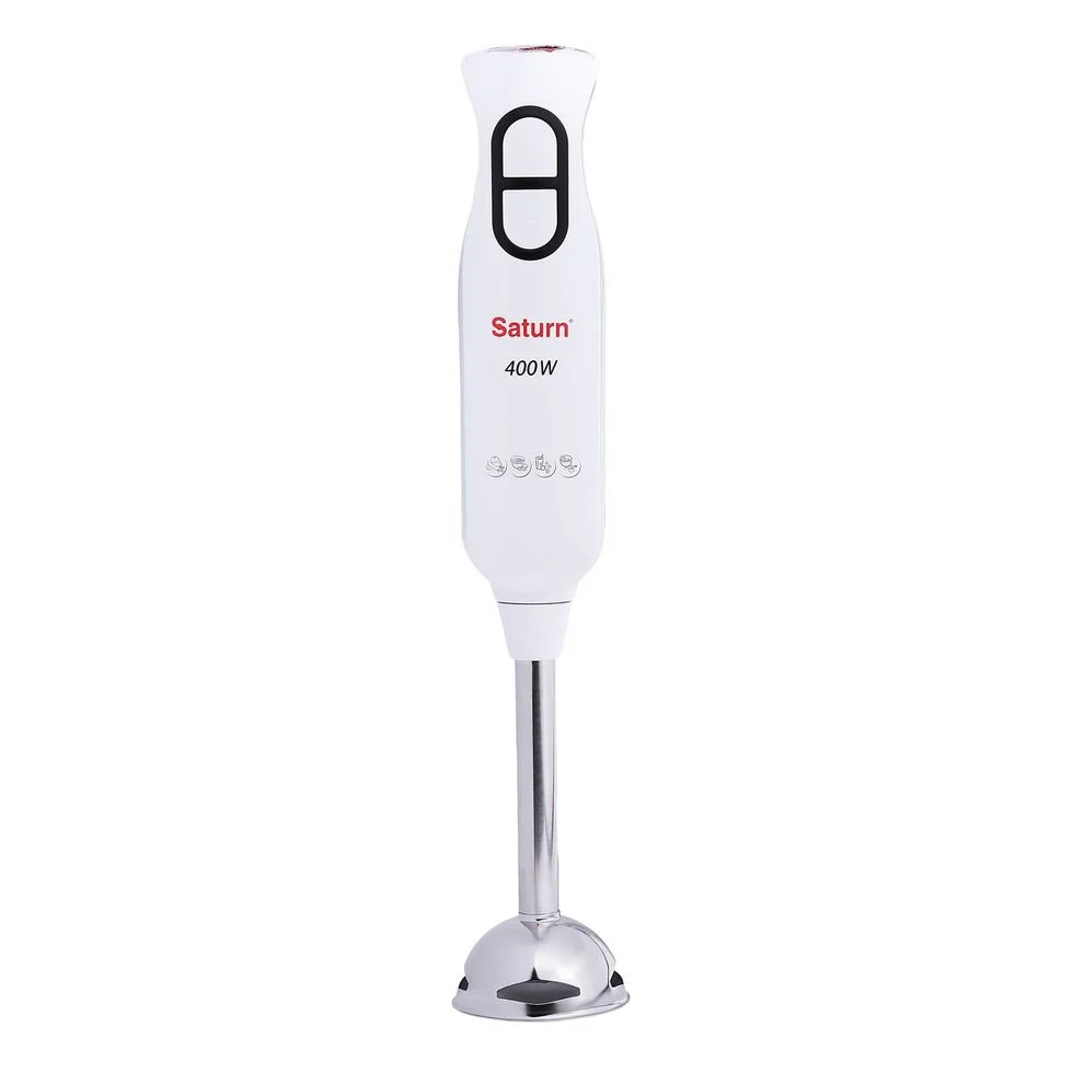 Одним из основных преимуществ этой модели является стильный дизайн. Белый корпус из качественного пластика. Управление находится на рукоятке блендера в центре. Двигатель работает с мощностью 400 Вт, благодаря этому блендер отлично справляется с функциями измельчения, дробления, смешивания и взбивания при наличии всего лишь одной насадки-блендера из нержавеющей стали.