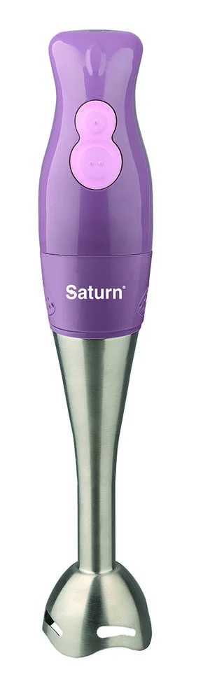 Одним из основных преимуществ этой модели является стильный дизайн. Фиолетовый корпус из качественного пластика. Управление находится на рукоятке блендера в центре. Двигатель работает с мощностью 400 Вт, благодаря этому блендер отлично справляется с функциями измельчения, дробления, смешивания и взбивания при наличии всего лишь одной насадки-блендера из нержавеющей стали.
