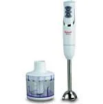 Блендер поставляется в комплекте с насадкой для измельчения, которая сделана из высококачественной прочной стали. Удобная форма насадки позволит добиться оптимальной плавности и однородности смешивания, а также предотвратить разбрызгивание. Корпус устройства выполнен из белого пластика с декоративными вставками серебристого цвета. В добавок к насадке-блендер в комплект также входит чоппер ёмкостью 400 мл. Наличие чоппера во многом упрощает процесс подготовки и обработки продуктов. С его помощью очень просто измельчать фрукты или овощи, измельчать фарш, делать коктейли и смузи.