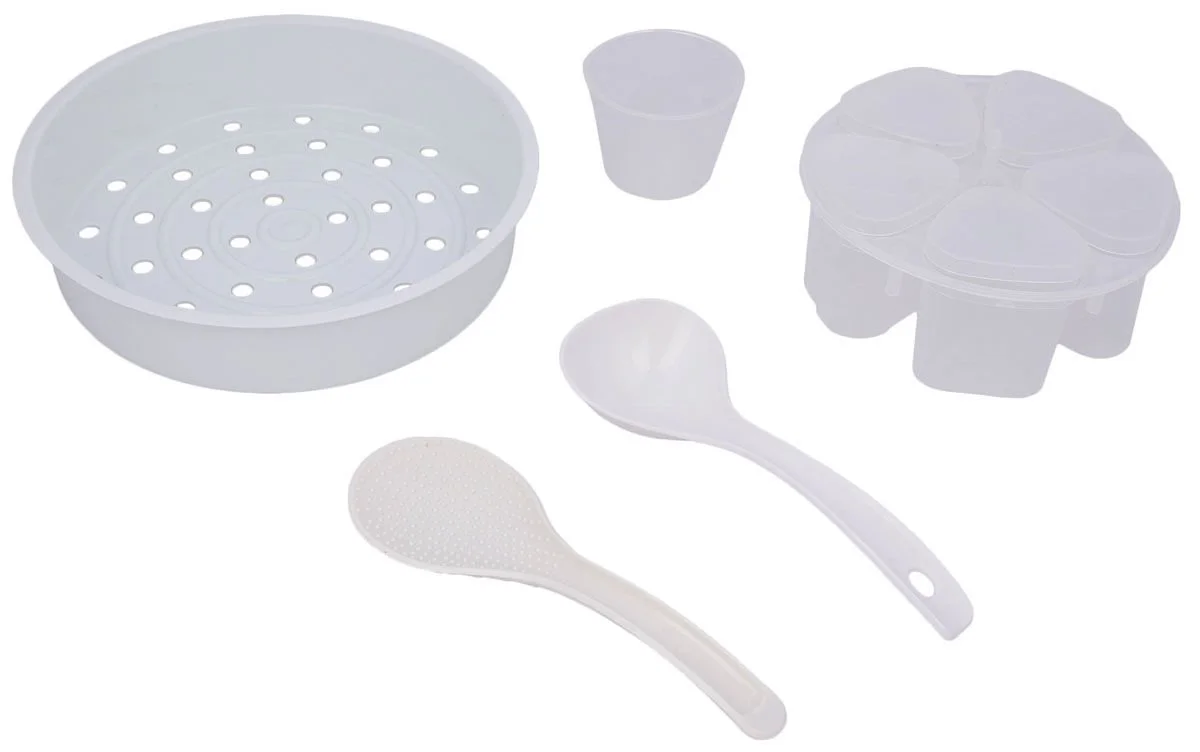 - Аксессуары: мерная чашка, ложка для супа, ложка для риса, насадка для приготовления на пару, чаши для йогурта, книга рецептов
