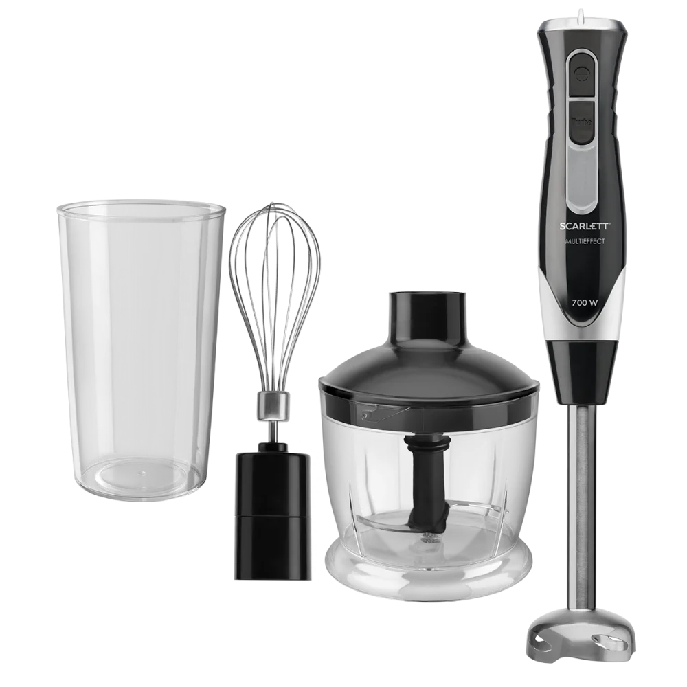 Погружной блендер Scarlett SC-HB42F56 может заменить сразу несколько кухонных приборов. Венчик взобьет сливки, яичные белки, замешает лёгкое тесто для блинчиков. Измельчитель объемом 600 мл быстро переработает овощи в овощную зажарку, измельчит мясо или орехи. Погружная насадка сделает однородное и нежное пюре для детского питания, супов, соусов. 20 скоростных режимов позволят подобрать оптимальный для мягких и твёрдых ингредиентов, а с особенно сложными продуктами справится режим Turbo. Благодаря мощности 700 Вт самые трудоёмкие задачи будут решены за считанные секунды. Поворотный переключатель удобно расположен на рукоятке, так что вы сможете регулировать процесс одной рукой, не прерываясь. Для точного следования рецепту Вам пригодится мерный стакан. Его объём 600 мл и Вы сможете использовать его для взбивания коктейлей. «Нога» блендера оснащена ножом MULTIEFFECT с двумя укороченными лезвиями для увеличения режущей силы. Рукоятка блендера имеет эргономичную форму, благодаря которой Ваша рука не устанет даже при длительном использовании.
