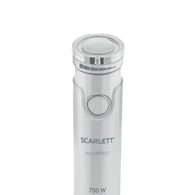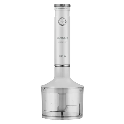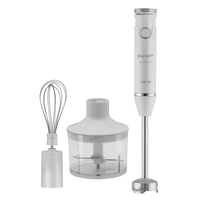 - Погружной блендер Scarlett SC-HB42F91 оснащён мощным мотором 700 Вт, к нему прилагается мини-измельчитель и венчик, с помощью которых можно измельчать продукты, готовить тесто, взбивать крем, выполнять другие задачи.