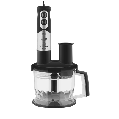 Кухонный процессор Scarlett SC-HB42K01 - удобный и максимально простой в использовании прибор, благодаря ему вы быстро и просто приготовите пюре, супы, муссы, рагу и другие блюда, а благодаря насадке для терки и шинковки вы сможете сделать салаты, зажарки и заготовки на зиму легко и не опасаясь травмировать руки. Прибор компактен и, при своей многофункциональности, не займет много места на вашей кухне. Это мощное устройство на 1000 Вт с 5 скоростями и режимом Turbo поможет вам добиться максимально быстрого результата. Модель оснащена ножом MULTIEFFECT с двумя укороченными вертикальными лезвиями для переработки самых твердых продуктов.