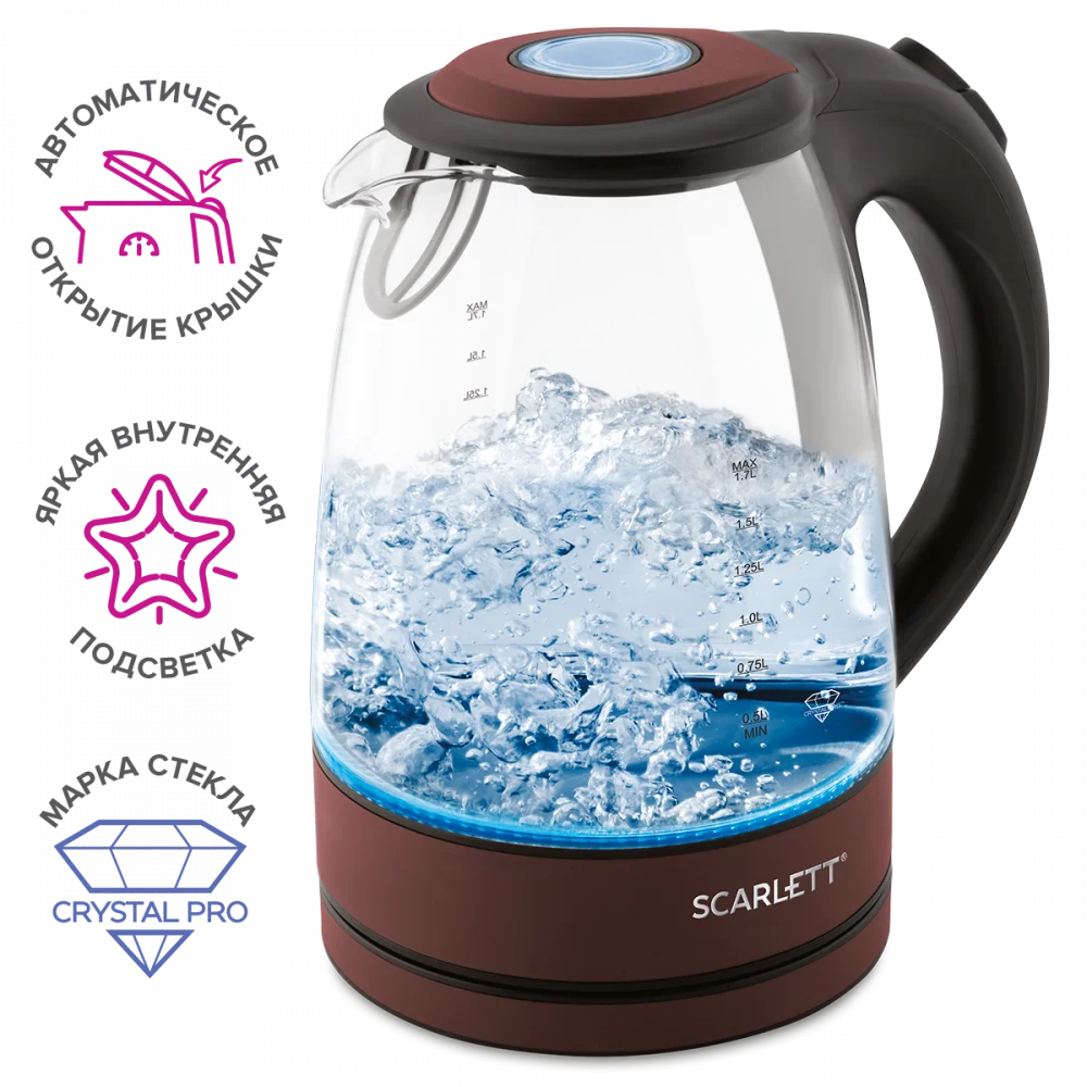 Электрический чайник SC-EK27G98 - стильный и комфортный помощник на кухне и в офисе. Элегантный дизайн и яркая внутренняя подсветка во время работы сделают прибор настоящим элементом интерьера, а корпус из высококачественного термостойкого стекла Crystal Pro позволит наблюдать за завораживающим процессом кипячения воды. Съёмный фильтр, закрытый нагревательный элемент, удобство хранения электрошнура. Прибор оснащён многоуровневой системой защиты Safe Work: автоматическое отключение при закипании, отключение при недостаточном количестве воды.