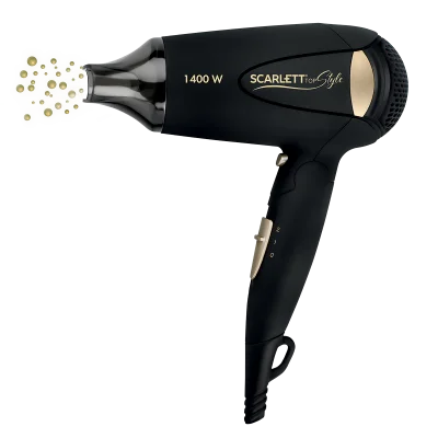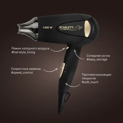 Фен Scarlett TOP STYLE SC-HD70IT10 мощностью 1400 Вт оснащён технологией Advanced tourmaline - защита волос от обезвоживания и пересушивания при сушке поможет любой девушке сделать укладку мечты. Прибор оснащен средней мощностью - легко получить естественную укладку без пересушивания. Складная ручка обеспечивает удобство хранения и дарит возможность брать прибор поездки, что идеально для путешественников! Присутствует режим холодного воздуха для фиксации прически. Корпус SC-HD70IT10 выполнен из термостойкого пластика, Покрытие «soft-touch», автоматическое отключение при перегреве, удобная петелька для подвешивания, насадка - сопло.