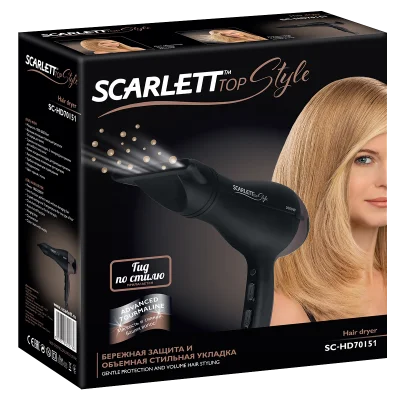 ФЕН Scarlett TOP STYLE SC-HD70I51 в стильном черном дизайне - простой и лёгкий способ выглядеть неотразимо каждый день. Прибор мощностью 1800 Вт оснащен функцией ионизации, 2 режимами мощности потока воздуха, 3 режимами температуры потока воздуха, что поможет выбрать подходящий для любого типа волос! Режим холодного воздуха улучшит фиксацию прически. Автоматическое отключение при перегреве позаботится о безопасности во время эксплуатации.