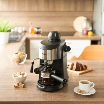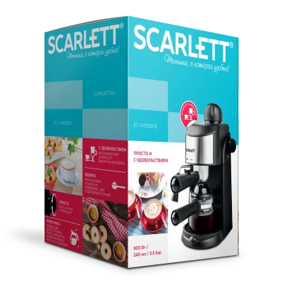 Кофеварка бойлерного типа SC-CM33005 мощностью 800 Ватт оснащена кофейником из термостойкого стекла. Классическое сочетание цветов с металлической декорацией впишется в любой интерьер. Прибор имеет давление 3,5 Бар. Оптимальная емкость резервуара для воды 240 мл, съемный держатель для фильтра, съемный поддон для сбора капель, мерная ложка с уплотнителем - сделают эксплуатацию прибора максимально простой. Кофеварка оснащена капучинатором, который позволяет получить густую пенку на молоке.