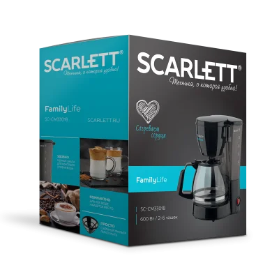 Кофеварка SC-CM33018 мощностью 600 Вт выполнена в классическом черном цвете.