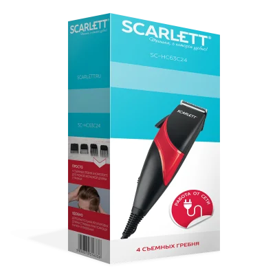 Машинка SC - HC63C24 с четырьмя сменными насадками для регулировки длины стрижки волос от 3 до 12 мм.