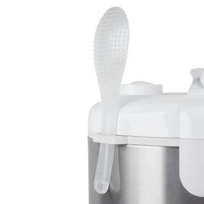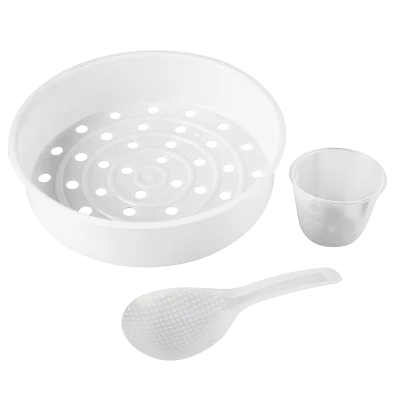 Ложка для перемешивания, мерный стакан, емкость для приготовления на пару и книга рецептов в комплекте.
