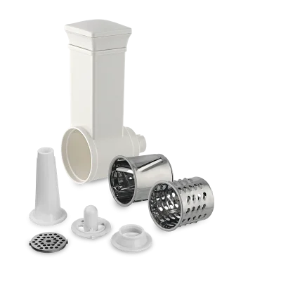 Помимо насадки-мясорубки для приготовления фарша из разных продуктов в комплектацию входят тёрка и шинковка для овощей и фруктов, а также насадки для приготовления колбас и кеббе, чтобы максимально расширить возможности прибора.