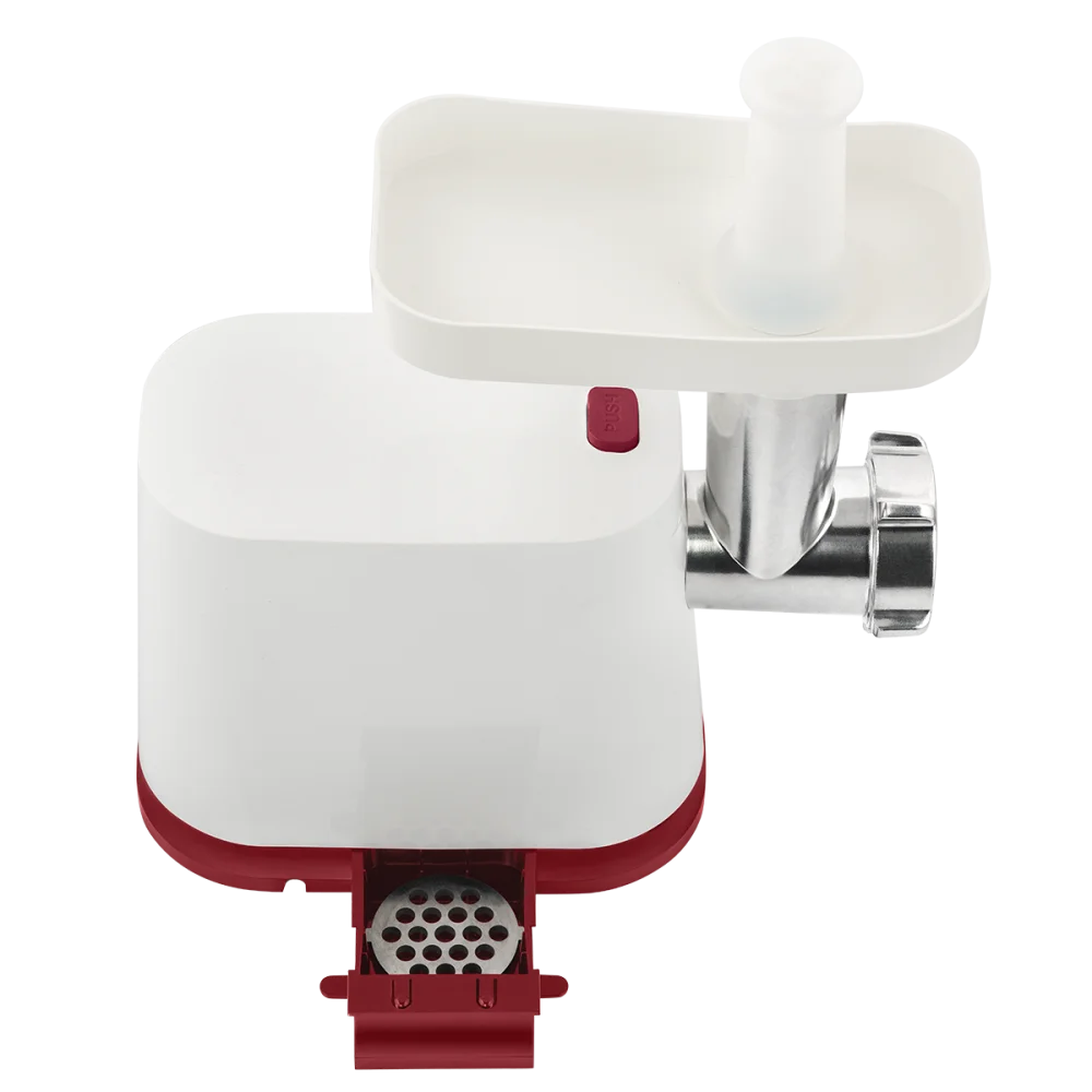 У прибора очень простое управление. Одна кнопка отвечает за включение, выключение и реверс. Если жилки и мясные волокна заблокируют шнек, вы сможете провернуть их обратно, не разбирая мясорубку.