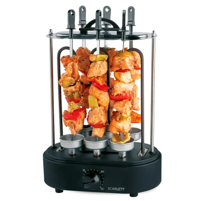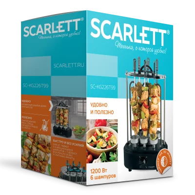 - Шашлычница SCARLETT SC-KG226T99 - отличное решение не только для любителей шашлыка, но и для тех, кто ценит своё время! Благодаря автоматическому вращению шампуров обед приготовится сам. 6 съемных шампуров, защитный кожух, 6 съемных ограничителей – насадок для фиксации шашлыка и кебаба, 6 съемных чашек для сбора сока и удобная ручка для переноски - этот прибор удобен в использовании и на даче, и дома. Керамический нагревательный элемент быстро нагревается