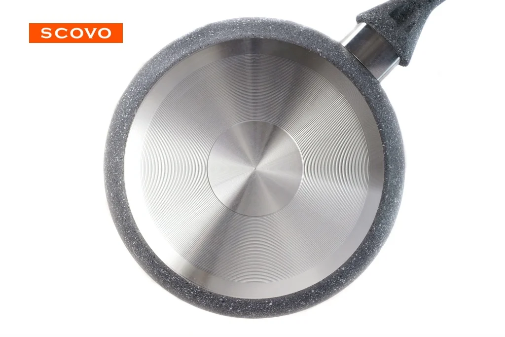 Для того чтобы порадовать домашних вкусным блюдом недостаточно просто подобрать интересный рецепт: необходимо, чтобы посуда, на которой вы готовите, отвечала современным стандартам качества и безопасности. Сковорода SCOVO Stone Pan гарантирует, что ваше блюдо порадует родных насыщенным вкусом, а мраморная прочность позволит долгое время наслаждаться надежностью приготовления. С одинаковым успехом обжаривайте грудку птицы под соевым соусом или тушите свинину с пряными овощами - равномерный нагрев алюминиевого основания толщиной 3 мм гарантирует быстроту и надежность приготовления!