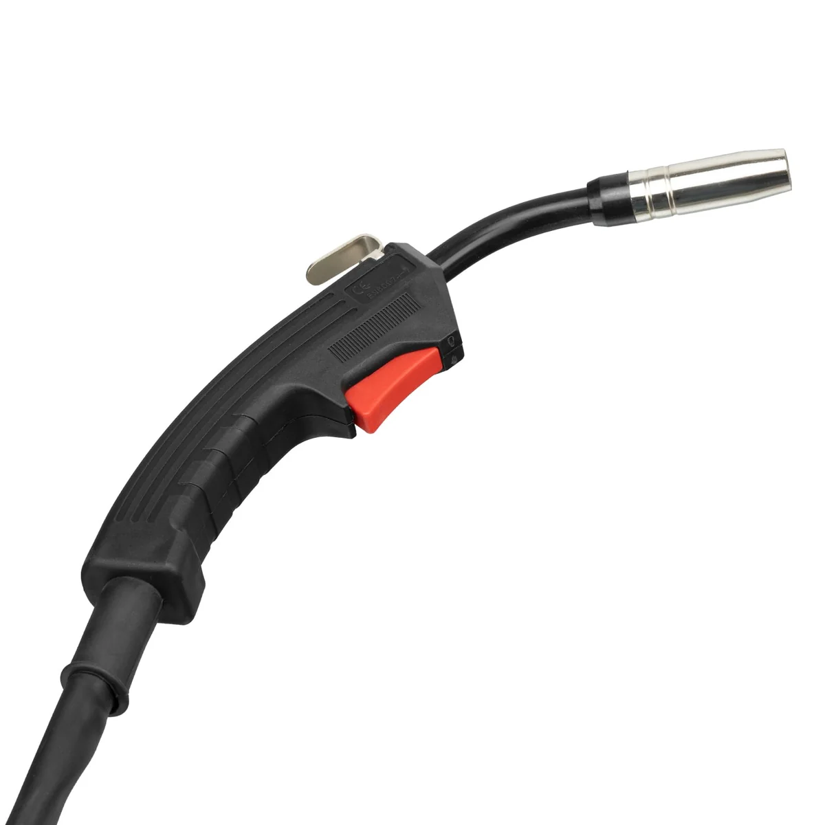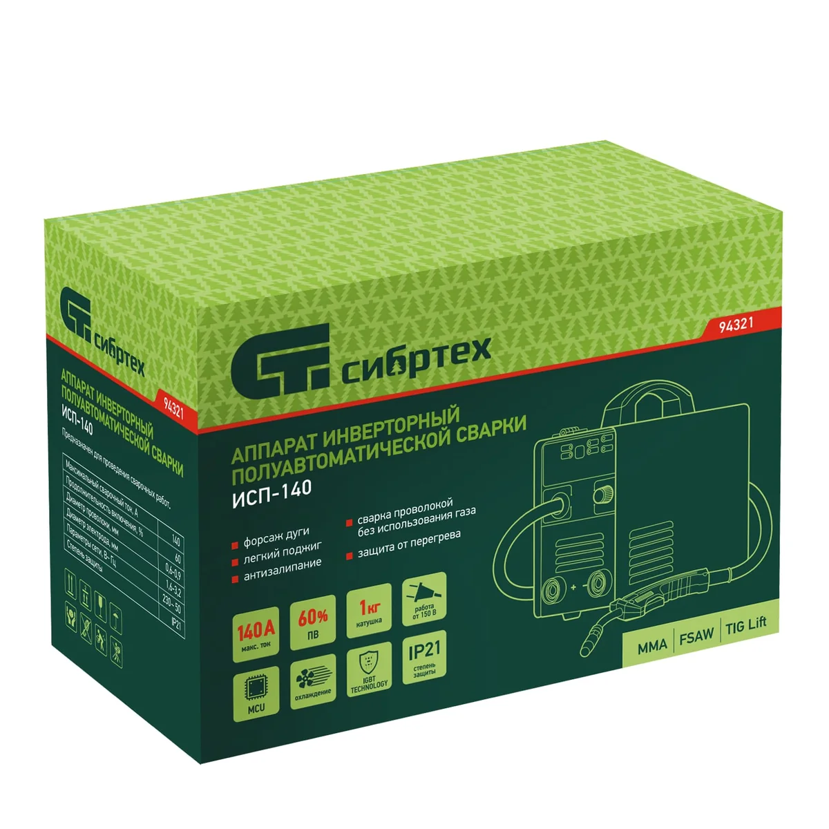 Инверторный аппарат полуавтоматической сварки Сибртех ИСП-140 94321 работает с максимальным сварочным током 140 А, время продолжительности включения составляет 60%. Аппарат позволяет работать в режимах MMA (сварка покрытым электродом диаметром до 4 мм), сварки флюсовой проволокой FCAW диаметром 0,8/0,9 мм без подачи газа и в режиме аргонодуговой сварки неплавящимся вольфрамовым электродом LIFT TIG (горелка в комплект не входит). Применение передовой инверторной технологии IGBT обеспечивает стабильный постоянный сварочный ток на выходе. Аппарат подходит для профессионального использования.ПреимуществаШирокие возможности — аппарат можно использовать для сварки сталей и черных металлов.Удобное управление — выбор режима осуществляется поочередным нажатием кнопки, значение сварочного тока устанавливается при помощи поворотного регулятора, для режима MIG предусмотрена возможность ручной регулировки компенсации напряжения.Аварийная индикация — в случае перегрева загорается световой сигнал, оповещающий о необходимости охлаждения устройства.Функциональность — скорость подачи проволоки регулируется автоматически в зависимости от ее толщины и выбранной величины сварочного тока.Компактные расходники — сварочный аппарат совместим с катушками диаметром до 100 мм (1 кг).Готовность к работе — в комплект входят горелка и сварочные провода с электрододержателем и зажимом «земля».Комфортное перемещение — аппарат весит 5,5 кг, на корпусе предусмотрена удобная ручка.