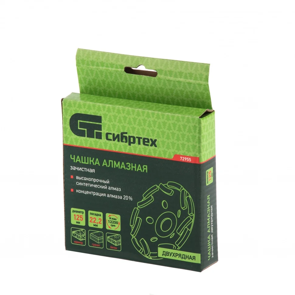 Двухрядная зачистная алмазная чашка Сибртех 72955 диаметром 125 мм устанавливается на углошлифовальную машину с посадочным размером 22,2 мм. Она оптимально подходит для интенсивной черновой обработки бетонных, каменных, мраморных, кирпичных и гранитных поверхностей, позволяет готовить их к последующей отделке. Чашка справится с такими задачами, как снятие толстого слоя бетона, выравнивание швов и устранение наплывов после снятия опалубки, удаление крупных дефектов. Изделие предназначено для бытового применения.ПреимуществаАлмазные сегменты нанесены на чашку в два ряда, что значительно повышает продуктивность работы.Увеличенный ресурс чашки обеспечивается за счет высоты рабочей части 5 мм и высокопрочных синтетических алмазов.Стальной корпус покрыт эмалью, предохраняющей чашку от образования коррозии.Отверстия на корпусе обеспечивают эффективный отвода шлама.