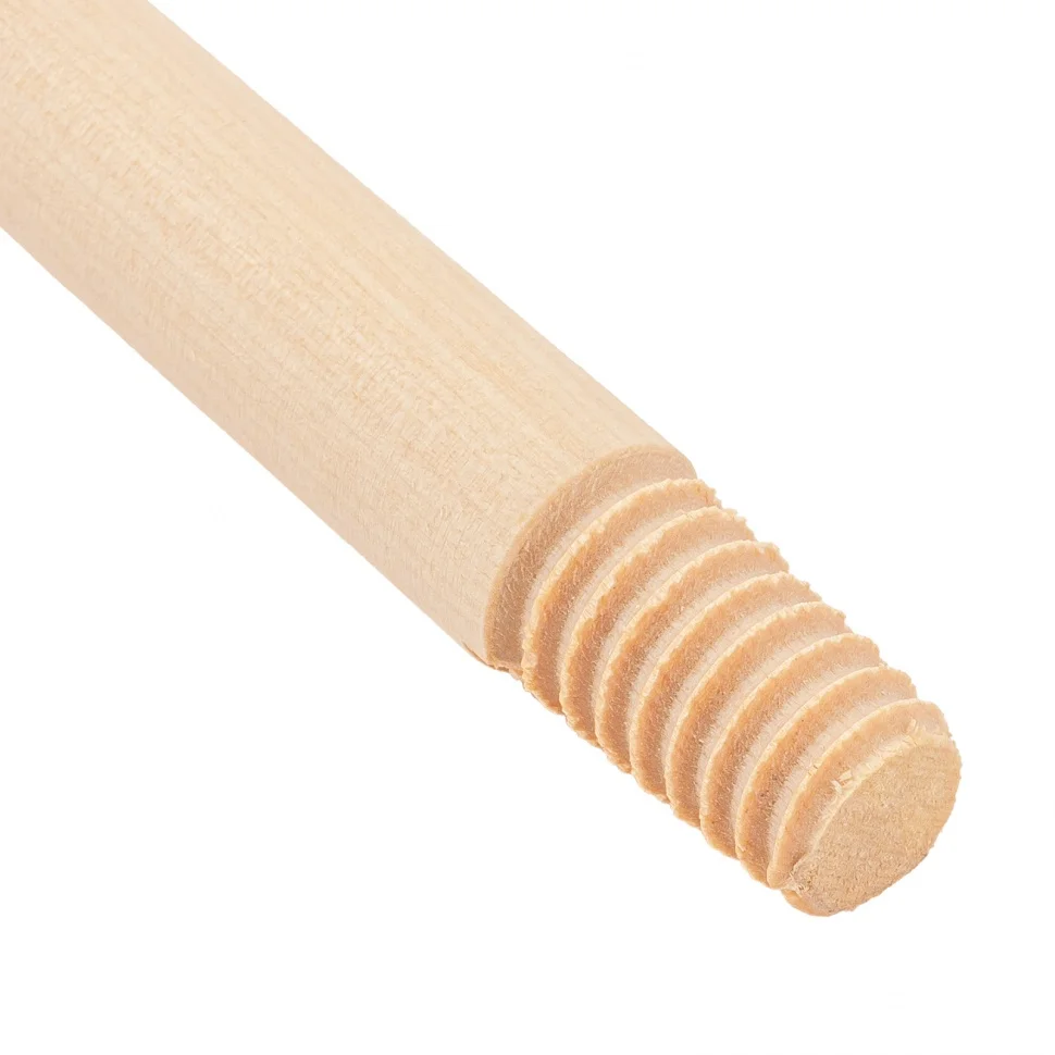 Деревянный черенок с затыловкой изготовлен из древесины лиственных пород высшего сорта.Двойное шлифование делает поверхность черенка гладкой.Благодаря сушке в термокамере исключается возможность возникновения плесени.Окончание черенка выполнено в виде резьбового наконечника для насаживания инструмента с резьбовой тулейкой.Диаметр адаптирован под посадочное место метел и щеток.