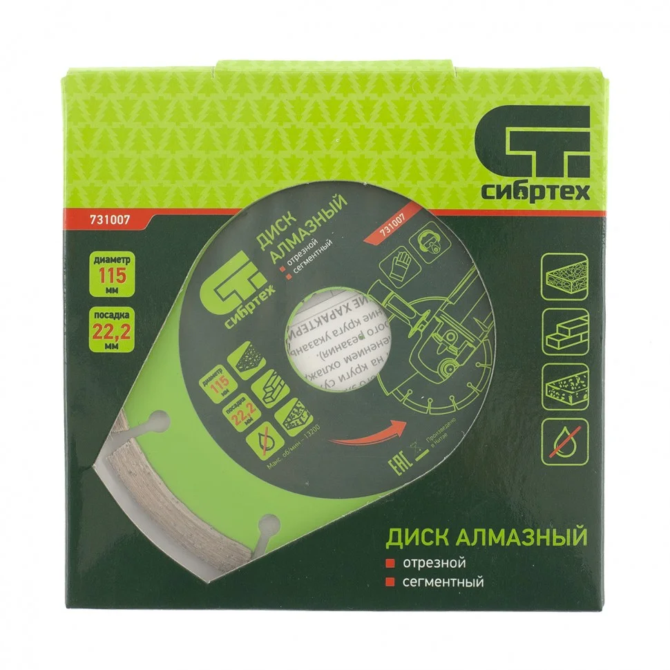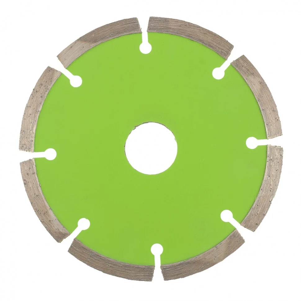 Диск алмазный отрезной сегментный Сибртех 731007, 115 х 22,2 мм, применяется для сухой резки бетона, камня, шлакоблока, тротуарной плитки и кирпича. Устанавливается на углошлифовальные машины с посадочным диаметром 22,2 мм. Оптимален для решения бытовых задач. Благодаря высокому рабочему ресурсу диск подходит для интенсивной работы.ПреимуществаСегментное строение диска способствует активному отведению тепла и пыли, поэтому водяное охлаждение не требуется.Режущая кромка шириной 7 мм обеспечивает хорошее качество и скорость реза.Рабочий слой нанесен методом холодного прессования, благодаря чему диск характеризуется износостойкостью.