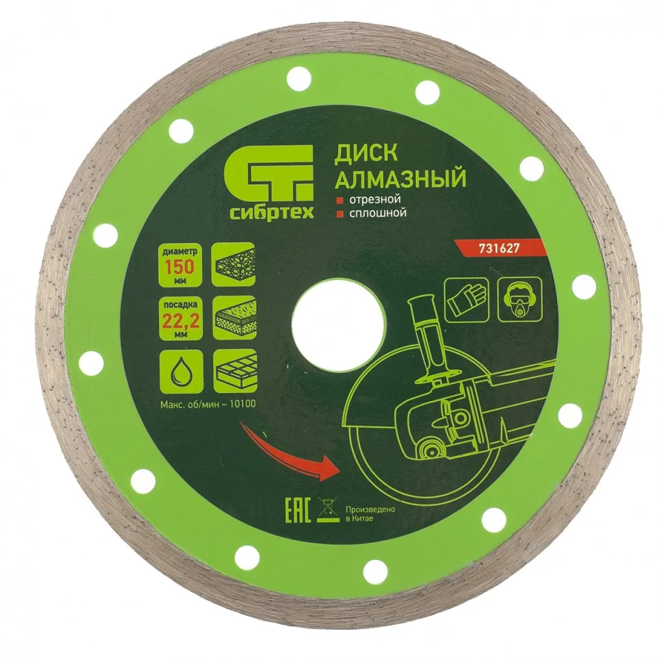 Диск алмазный отрезной сплошной Сибртех 731627, 150 х 22,2 мм, применяется для мокрой резки керамогранитной, керамической плитки, а также мрамора и камня. Он используется в качестве оснастки для болгарок и плиткорезов с посадочным диаметром 22,2 мм. рез материалов необходимо проводить с водяным охлаждением. Диск обладает хорошим рабочим ресурсом и рассчитан на долгую службу.ПреимуществаСплошная режущая часть обеспечивает ровный и чистый срез без сколов.Высококачественные алмазы надежно удерживаются металлической связкой, поэтому производительность диска остается неизменной.Ширина рабочей части 6 мм позволяет успешно использовать диск в быту.Перфорация обеспечивает более качественное охлаждение диска и стабильность реза.Основание диска выполнено из стали 65MnE, а потому выдерживает резку твердых материалов без риска деформации.