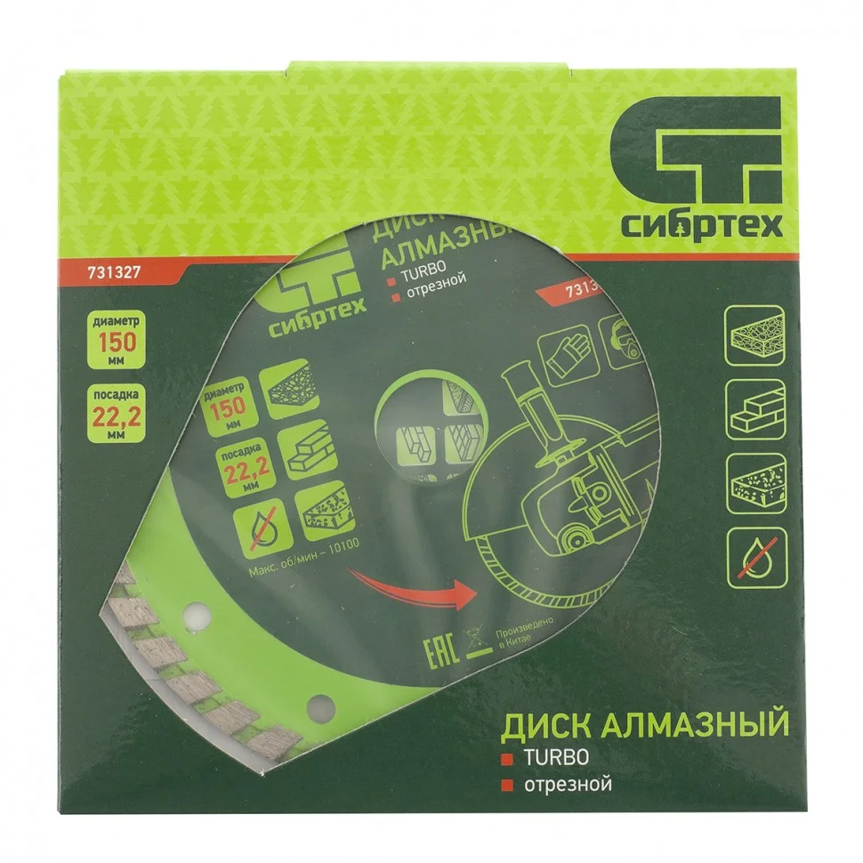 Алмазный отрезной диск Сибртех Turbo 731327 для сухой резки, 150 х 22,2 мм, устанавливается на углошлифовальные машинки и предназначен для использования в быту. Он позволяет резать твердые материалы - бетон, железобетон, камень, песчаник.ПреимуществаТурбированная рабочая часть с перфорацией эффективно отводит тепло и шлам, поэтому диск можно использовать для быстрой сухой резки без водяного охлаждения.Диск изготовлен методом холодного прессования, за счет чего успешно противостоит высоким нагрузкам.Алмазный слой шириной 7 мм обеспечивает хорошее качество реза.