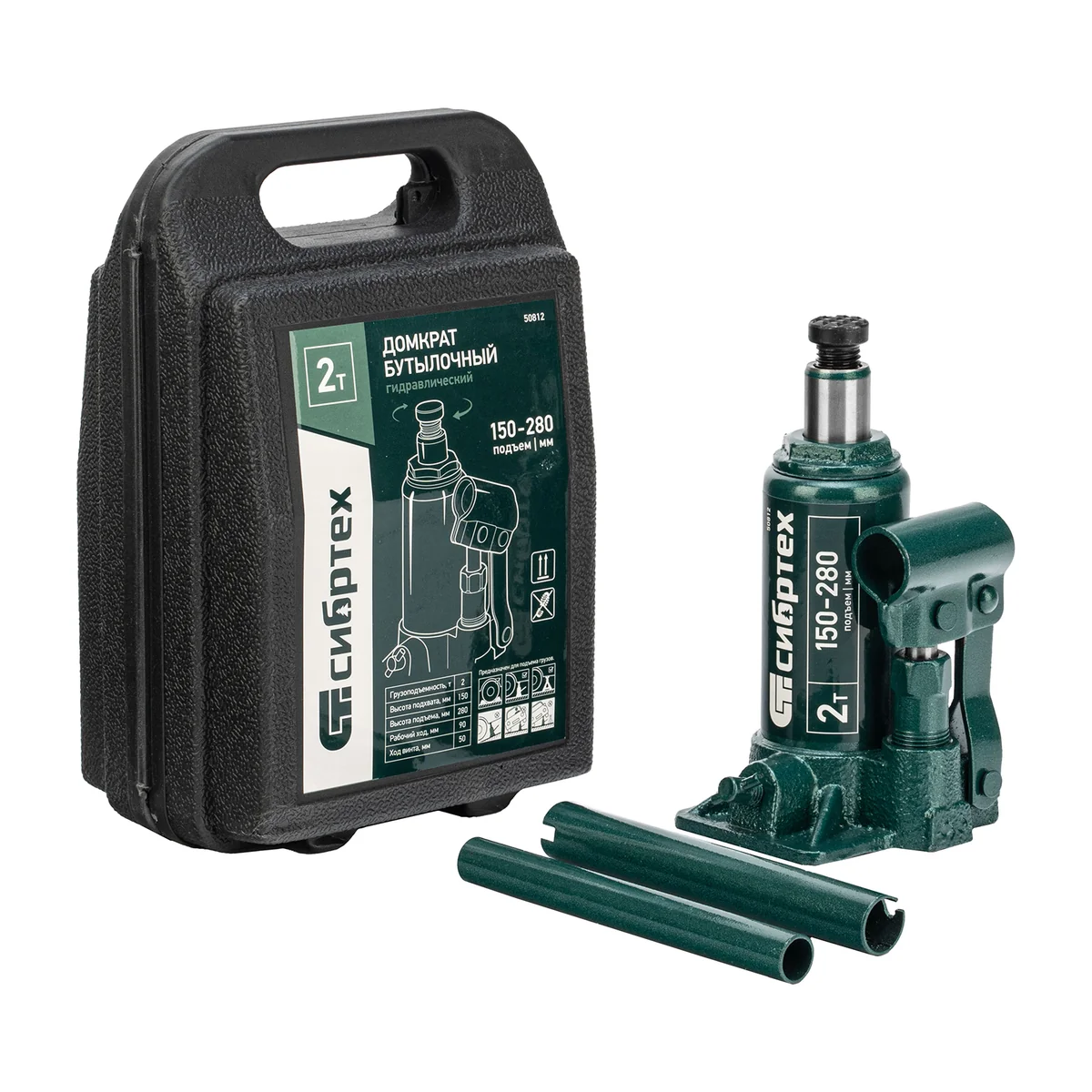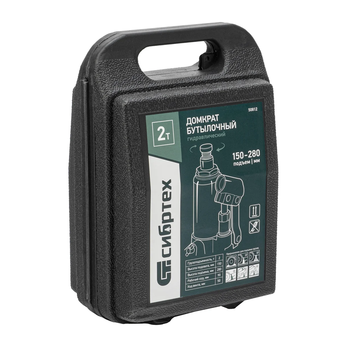Домкрат гидравлический бутылочный, 2 т, 150-280 мм, в пласт. кейсе Сибртех 50812