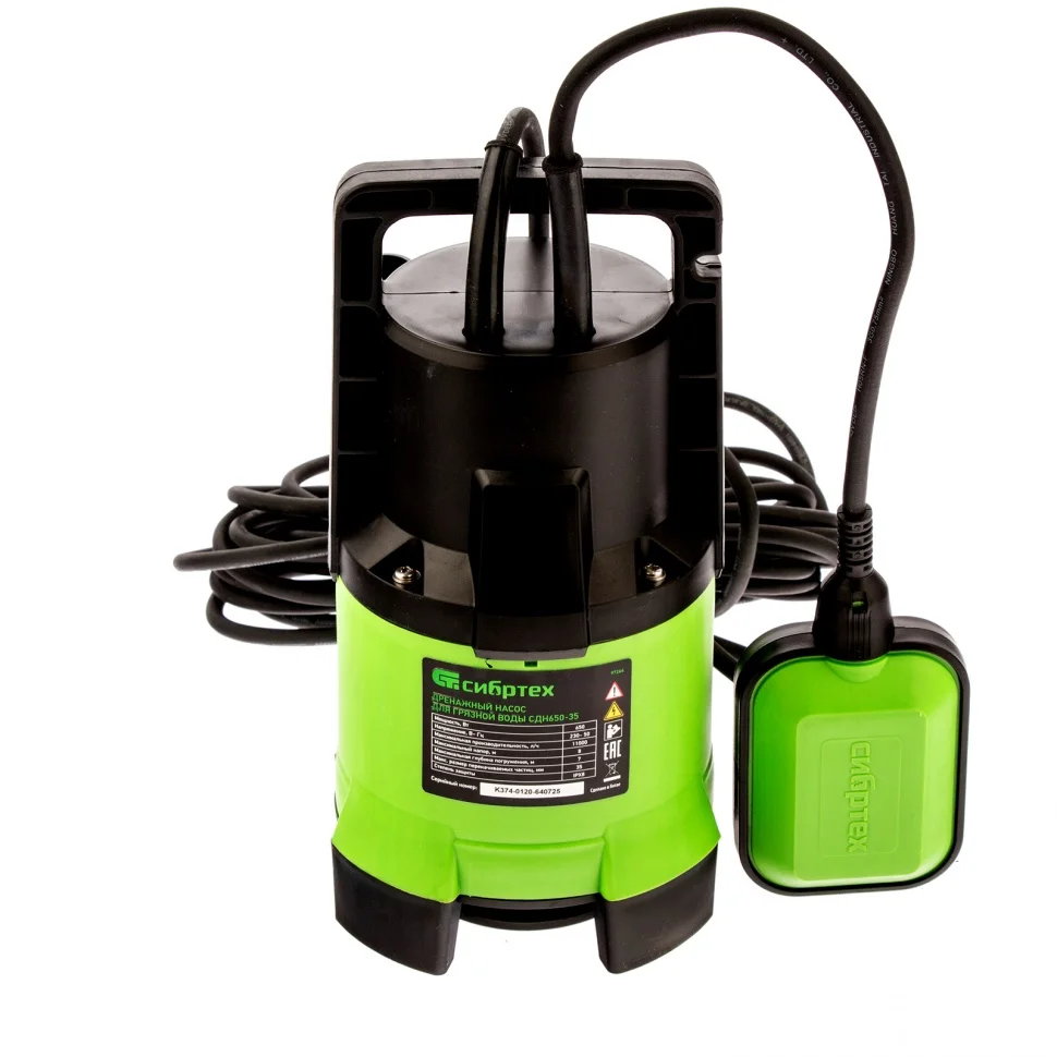 Погружной дренажный насос для грязной воды Сибртех СДН650-35 97264 мощностью 650 Вт и производительностью 11000 л/ч обеспечивает напор до 8 м. Используется для осушения подвалов, откачки сточных вод и бытовых отходов, организации поливочных и оросительных работ. Насос успешно справляется с перекачиванием воды, содержащей включения размером до 35 мм.ПреимуществаУдаропрочность — пластиковый корпус не боится механических повреждений, благодаря чему обеспечивается длительный срок службы насоса.Класс защиты IPX8 — двигатель и электрокомпоненты изолированы от проникновения воды.Защита от сухого хода — поплавковый механизм автоматически включает и выключает насос в зависимости от уровня воды, что исключает работу на сухом ходу.Правильная и удобная установка — к транспортировочной рукоятке можно привязать веревку для погружения и извлечения насоса.Простое обслуживание — для корректной работы насоса достаточно периодически промывать крыльчатку от скопившихся комков грязи под напором воды.Устойчивое положение — опоры в нижней части корпуса обеспечивают правильное положение насоса.Штепсельная вилка с заземлением — даже неопытный пользователь сможет правильно подключить устройство без риска удара током.