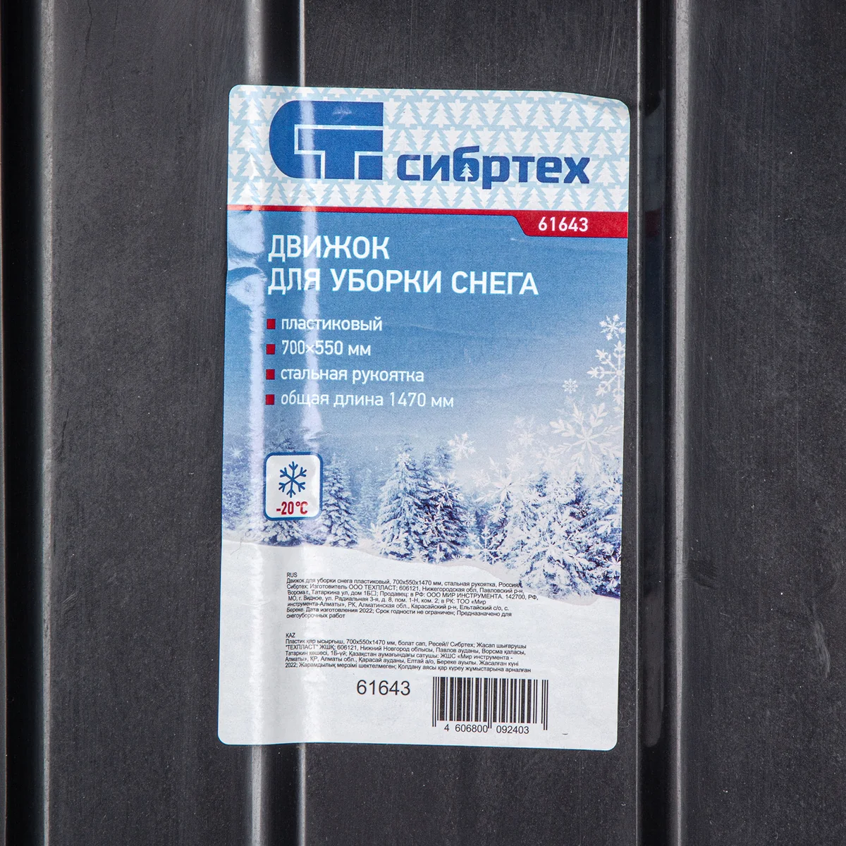 Движок для уборки снега пластиковый, 700х550х1470 мм, стальная рукоятка, Россия// Сибртех 61643