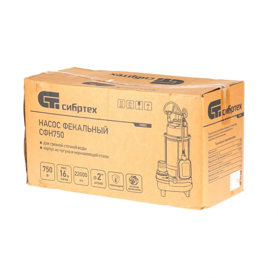 Фекальный насос Сибртех СФН750 99803 мощностью 750 Вт и производительностью 22000 л/ч обеспечивает напор 16 м и позволяет перекачивать как чистую, так и грязную воду с частицами диаметром до 25 мм на глубине до 5 м. Диаметр штуцера для шланга составляет 2 дюйма. Насос справляется с откачкой нечистот из выгребных ям, септиков и канализаций. Скорости перекачки хватит для организации дренажной системы осушения затапливаемых помещений и установки принудительной канализационной системы. Напора достаточно для установки систем полива на даче.ПреимуществаАвтономность — поплавковый выключатель не допускает работы на сухом ходу, контроль пользователя не требуется.Легкая установка — достаточно погрузить насос с помощью троса и установить в вертикальном положении.Термозащита — двигатель отключается автоматически при перегреве, что предотвращает его поломку.Долговечность — чугунный импеллер рассчитан на длительное использование.Надежность — корпус насоса изготовлен из чугуна и нержавеющей стали, что позволяет использовать его в агрессивной среде.Герметичность — насос имеет степень защиты IPX8, а значит, вода не попадает внутрь корпуса.Устойчивость — благодаря ножкам в нижней части корпуса насос не опрокидывается во время работы.Удобная транспортировка — в верхней части корпуса имеется ручка для перемещения насоса.
