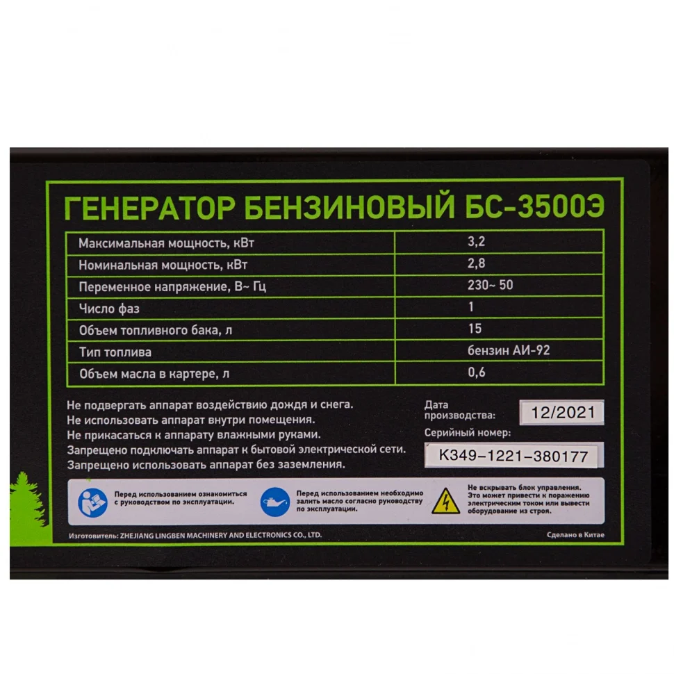 Генератор бензиновый БС-3500Э, 3.2 кВт, 230В, 4-х тактный, 15 л, электростартер Сибртех 94538