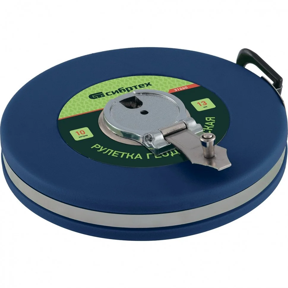 Геодезическая рулетка СИБРТЕХ 10 м х13 мм 31260 - это измерительный инструмент при проведении строительных и геодезических работ. Рулетка расположена в закрытом корпусе, изготовленном из ударопрочного АБС-пластика, усиленного стальной лентой. Механизм скручивания открывается с кнопки и расположен сбоку конструкции. Фибергласовая лента имеет на конце стальной складной зацеп.