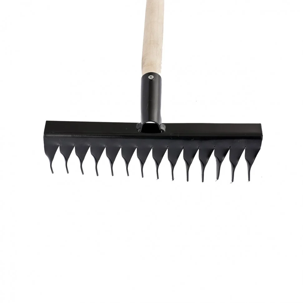 Стальные грабли Сибртех 61769 длиной 1300 мм, с 14 витыми зубьями и шириной гребенки 300 мм, служат для уборки с газонов и грядок листвы и мусора, а также позволяют проводить аэрацию почвы. Поставляются в сборе с деревянным черенком.ПреимуществаРабочая часть и тулейка изготовлены из конструкционной углеродистой стали, а зубья утолщены, поэтому грабли выдерживают большие нагрузки.Порошковое покрытие предотвращает появление коррозии, продлевая рабочий ресурс инструмента.Зубья имеют витую конфигурацию, поэтому эффективно разбивают комья земли и обеспечивают насыщение почвы кислородом.