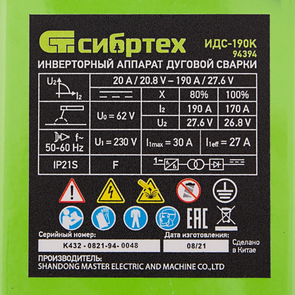 Инверторный аппарат дуговой сварки ИДС-190K, 190 А, ПВ 80%, диаметр электрода 1,6-4 мм Сибртех 94394