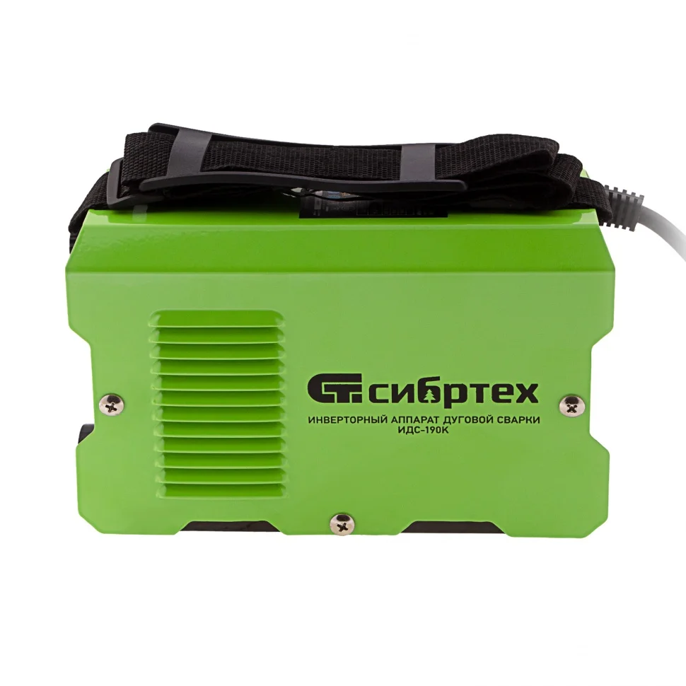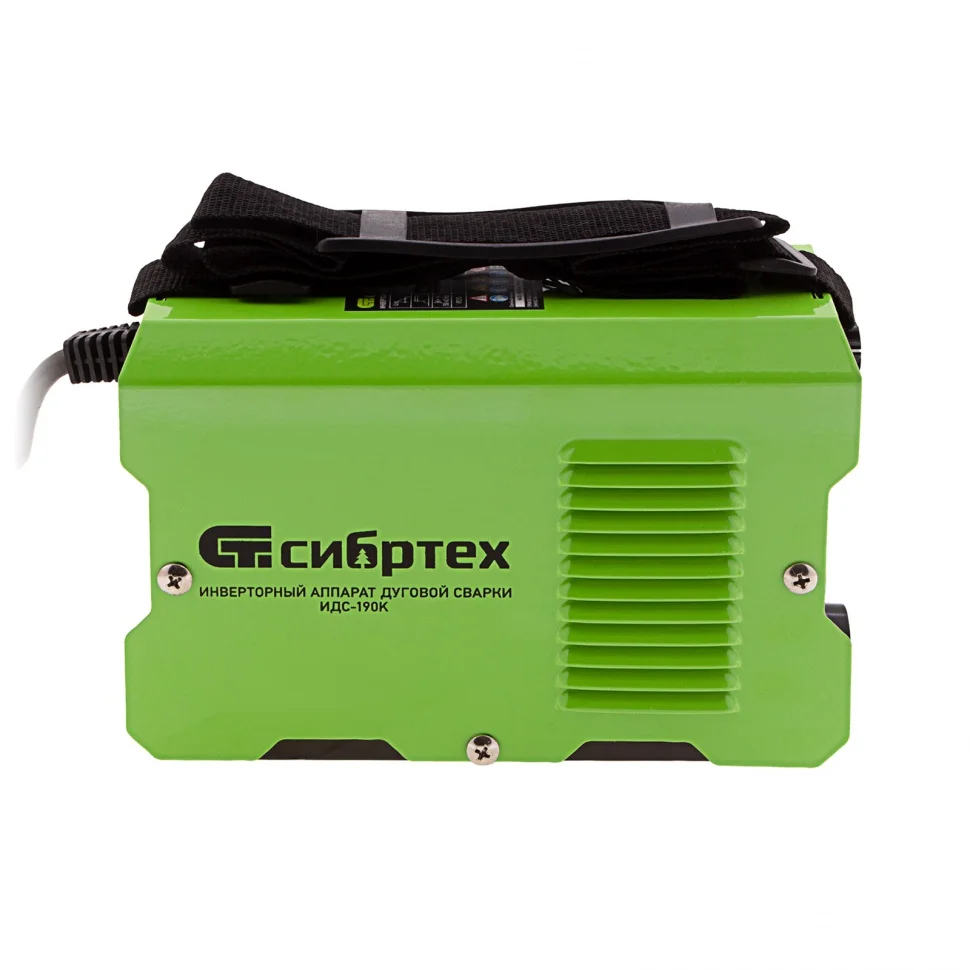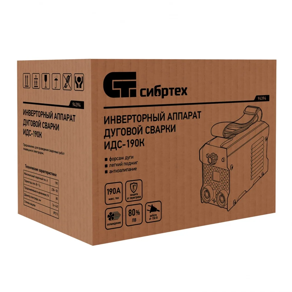 Инверторный аппарат Сибртех ИДС-190К 94394 подходит для использования в бытовых и производственных условиях. Используется для дуговой сварки изделий из низкоуглеродистой стали с помощью штучных электродов диаметром 1,6-4 мм. Диапазон сварочного тока составляет 20-190 А, продолжительность включения (ПВ) на максимальном токе 80% выгодно отличает данную модель. Аппарат не шумит, эффективно работает даже при нестабильном напряжении, оптимален для частных хозяйств, коммунальных служб, аварийно-ремонтных бригад.ПреимуществаГорячий старт (Hot Start) — начало сварочного процесса значительно облегчается благодаря увеличению сварочного тока в момент поджига дуги.Форсирование дуги (Arc Force) — обеспечение оптимальных характеристик дуги независимо от применяемого электрода позволяет добиться аккуратного и ровного сварного шва.Антизалипание электрода (Anti Stick) — снижение сварочного тока при пригорании расходника позволяет отделить его расходник от металла без риска повреждения обмазки.Высокий ресурс — аппарат отключается при риске перегрева и перегрузки, что позволяет продлить срок его эксплуатации.Удобство хранения и переноски — аппарат отличается компактными размерами, небольшим весом и комплектуется ремнем для переноски.Степень защиты IP21S — прямое попадание воды внутрь аппарата исключено.Полный комплект поставки — кабель с электрододержателем и кабель с зажимом «земля» не придется докупать отдельно.