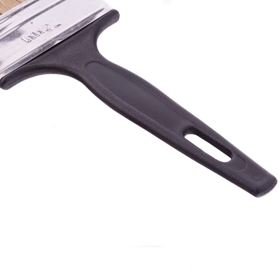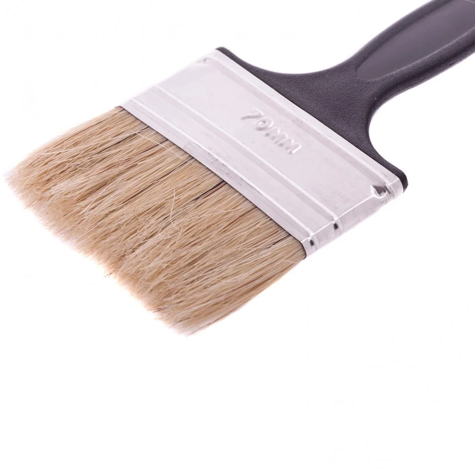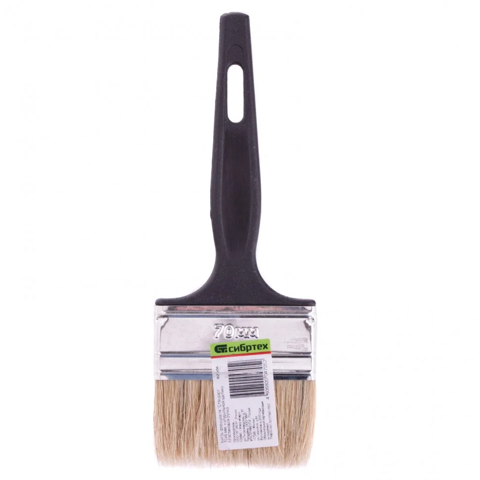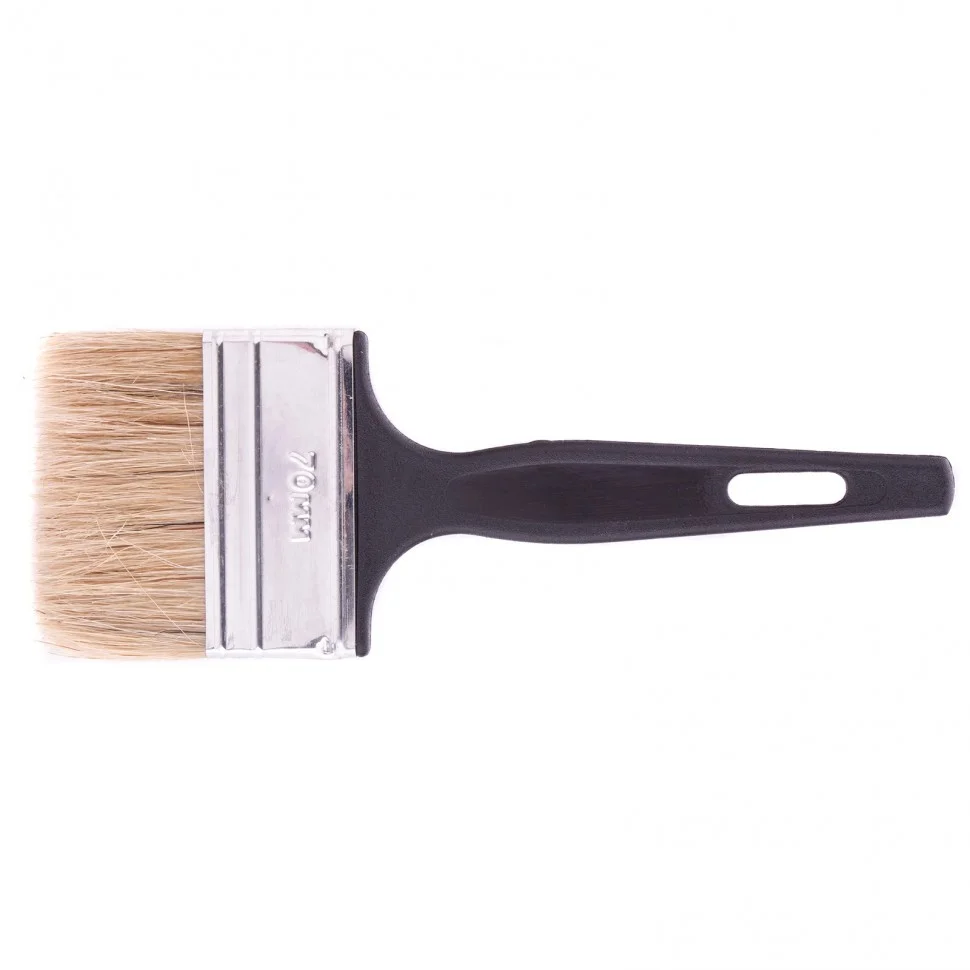 Флейцевая кисть Сибртех «Стандарт» 82506, 70*6, с натуральной щетиной и пластиковой ручкой оптимально подходит для финишной обработки поверхностей и устранения мелких дефектов после использования кистей с более жесткой щетиной. Кисточкой шириной 70 мм удобно окрашивать большие поверхности. Рабочая часть выполнена из свиной щетины с добавлением искусственной, таким образом достигается ее высокая износостойкость и устойчивость к растворителям.ПреимуществаВысокое качество окрашивания — щетина двойной выварки не содержит жира и посторонних примесей.Эффективность работы — кисть с расщепленной на концах щетиной хорошо впитывает, удерживает и отдает краску.Металлический бандаж — он обеспечивает надежную фиксацию щетины, а за счет антикоррозионного покрытия не боится воздействия влаги.Пластиковая ручка — кистью удобно работать, т.к. она хорошо ложится в руку.Подвесное хранение — на ручке предусмотрено продолговатое отверстие.