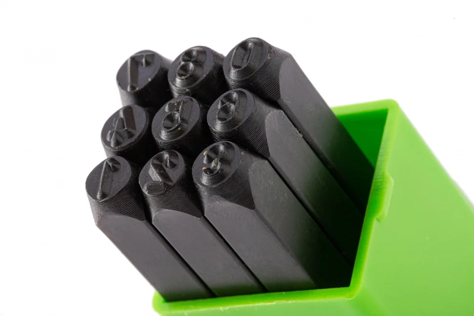Клейма штамповочные Сибртех 18844, 5 мм, используются для нанесения цифровой маркировки на изделия из металла и других материалов методом ударного воздействия. Они обработаны на станках с числовым программным управлением, поэтому отличаются точностью и превосходной читабельностью получаемых цифр.ПреимуществаВысокий ресурс и устойчивость к деформации - клейма выполнены из инструментальной среднеуглеродистой стали, рабочие части закалены.Оксидированное покрытие - изделия надежно защищены от коррозии.Пластиковый короб в комплекте - клейма удобно хранить вместе и брать с собой при необходимости.