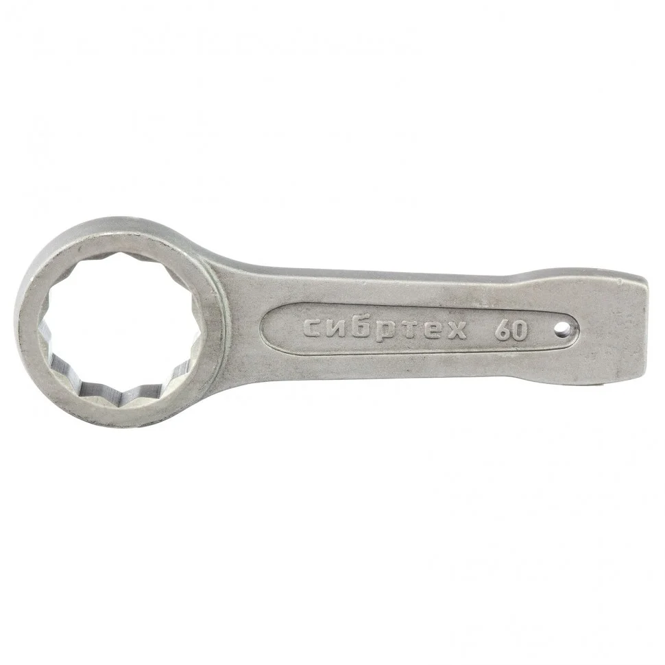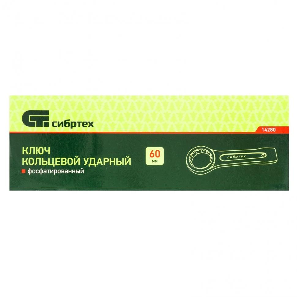 Кольцевой ударный ключ Сибртех 14280, 60 мм, позволяет откручивать и закручивать резьбовые соединения соответствующего размера. Он имеет 12-гранный профиль, за счет чего надежно удерживает головку крепежа. Инструмент удобен для работы в ограниченном пространстве — для перестановки его достаточно повернуть на 30 градусов. Ключ применяется в слесарных мастерских, будет также полезен во время ремонта оборудования или автомобилей.ПреимуществаОдна сторона ключа утолщена и предназначена для ударных воздействий, поэтому он эффективен при работе с туго затянутыми крепежами.Инструмент изготовлен из прочной углеродистой стали 45, выдерживает высокие нагрузки.При производстве ключа использована технология фосфатирования, поэтому он устойчив к коррозии и прослужит долго.