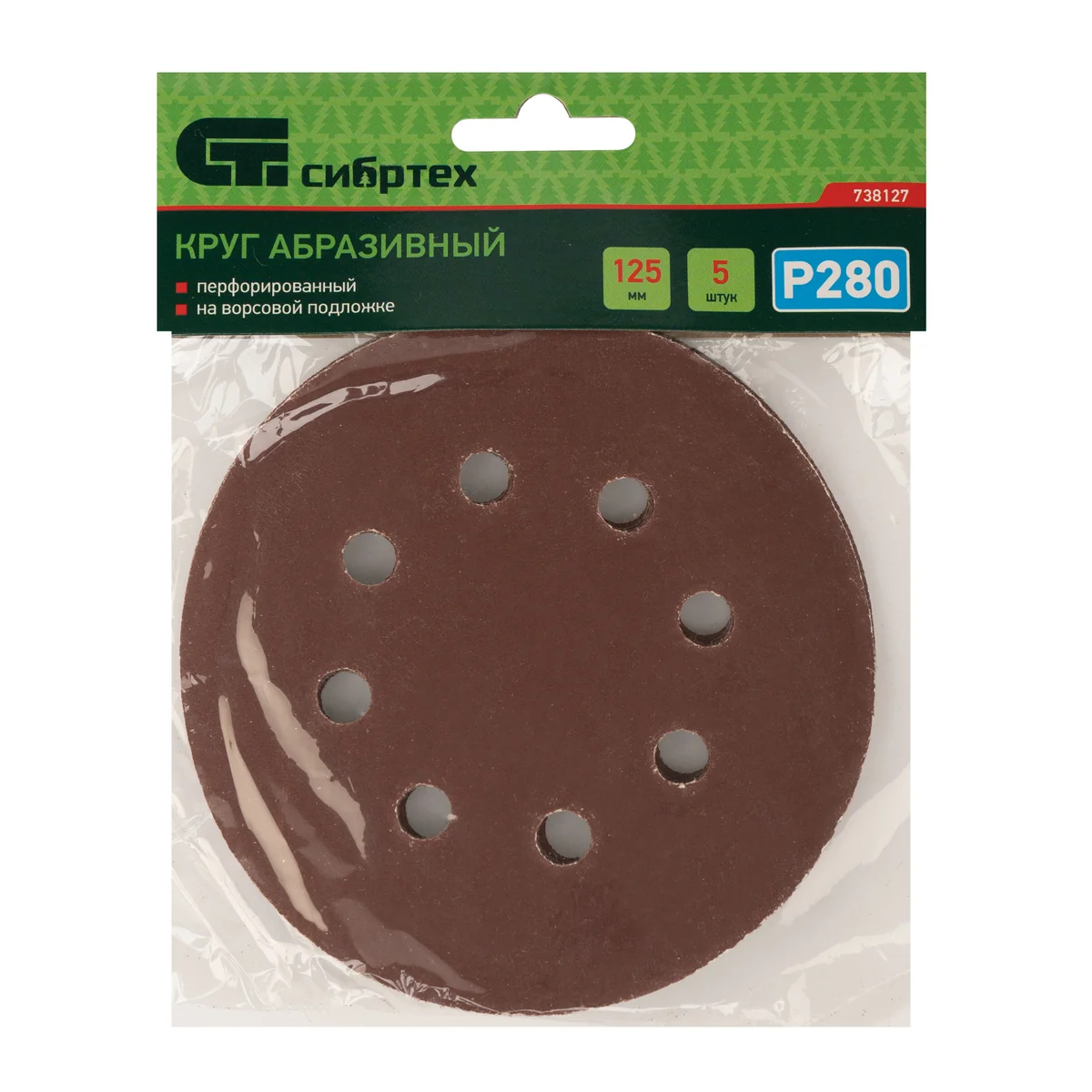 Круг абразивный на ворсовой подложке под "липучку", перфорированный, P 280, 125 мм, 5 шт Сибртех 738127