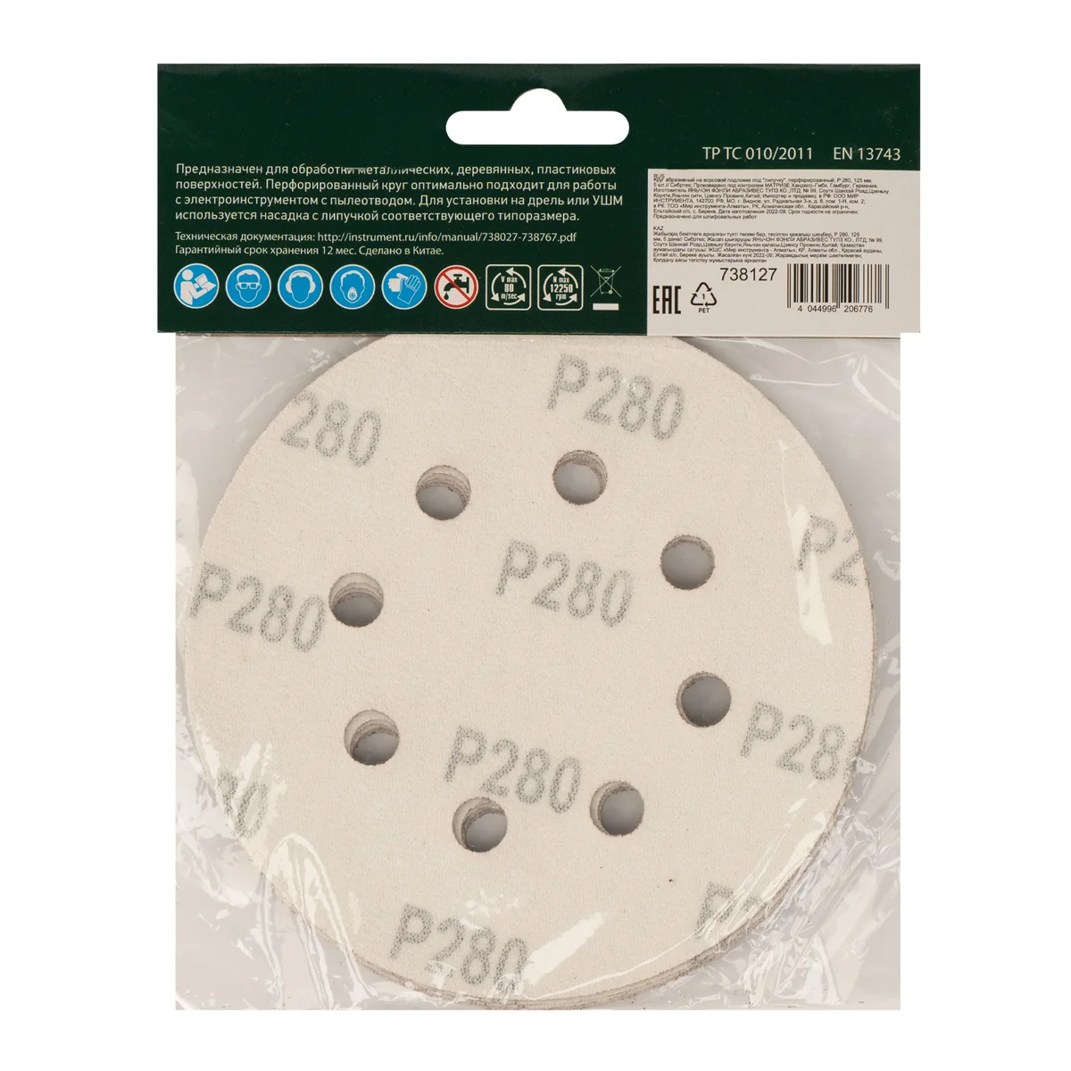 Абразивный круг на ворсовой подложке под «липучку» Сибртех Р280 арт. 738127 используется для сухого чернового шлифования металлических, деревянных, пластиковых и других поверхностей. Круг устанавливается на эксцентриковые (орбитальные) шлифовальные машинки с отводом воздуха или на дрель с помощью опорной насадки Сибртех. Мелкозернистый абразив Р280 позволяет избавиться от заусенцев, подходит для зачистки старого покрытия (краски/лака), удаления ржавчины, снятия слоя материала и окончательной шлифовки материала, а также шлифовке между покрытиями.ПреимуществаПерфорация обеспечивает эффективный отвод отработанного материала, особенно при шлифовке древесины, поэтому не придется отвлекаться на чистку круга и обрабатываемой поверхности.Ворсовая подложка позволяет быстро крепить круг к опорной тарелке на липучку.Набор из 5 кругов рассчитан на долгое применение.